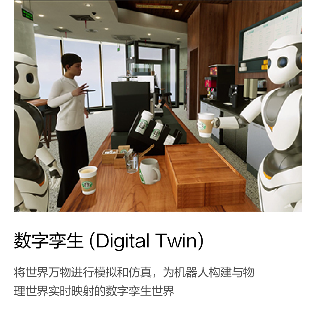 将世界万物进行模拟和仿真,为机器人构建与物理世界实时映射的数字孪生世界